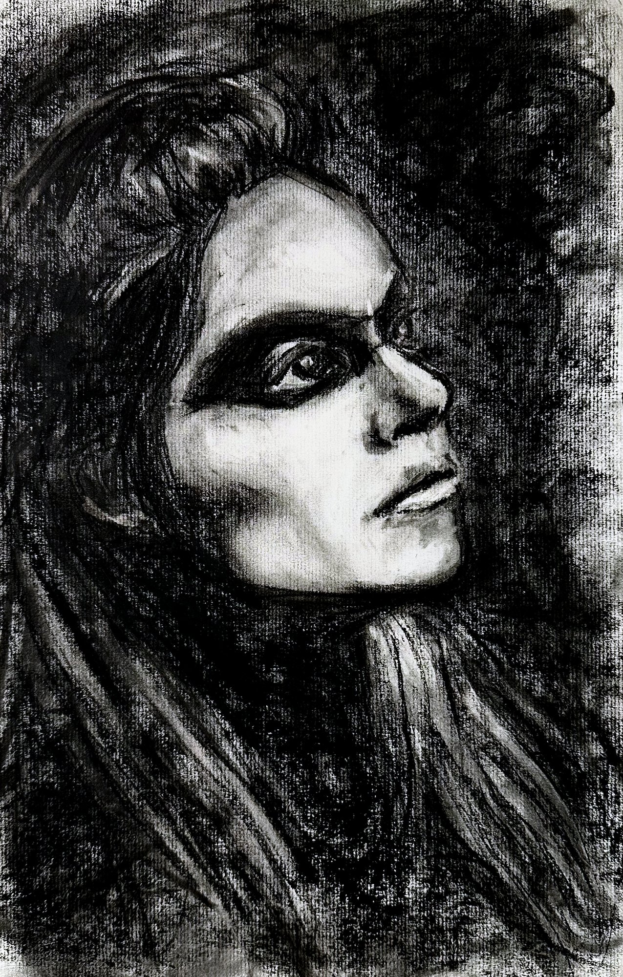 A large-format charcoal drawing that emphasizes depth, contrast, and emotional presence. The scale and tonal range create a strong visual impact, making it a centerpiece work.